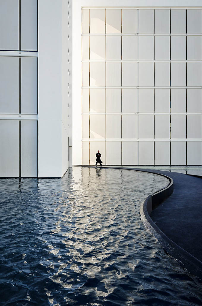 幾道圓滑的弧線劃過水面,形成了交織的步道。步道的盡端,室外休息平臺略低于水面,保證開闊的視野不受干擾。黑色的池底鋪裝讓淺淺的水池看起來似乎深不見底,和純白色的建筑體量形成了鮮明對比。而在夜晚,當(dāng)夢幻的彩色燈光亮起,給建筑增添了一份神秘的色彩。