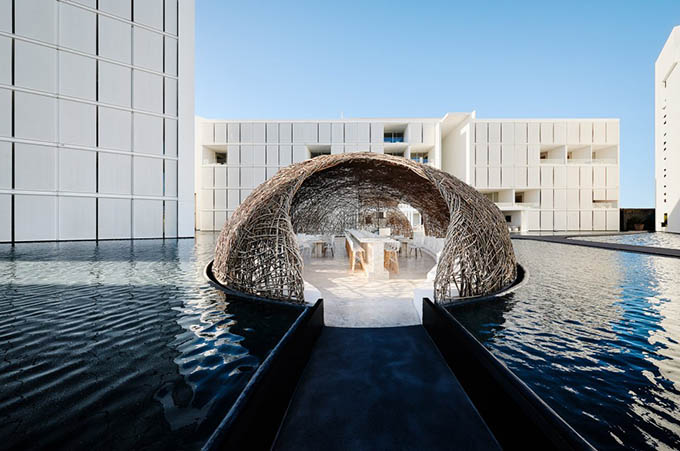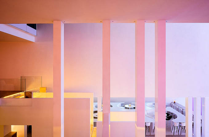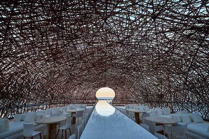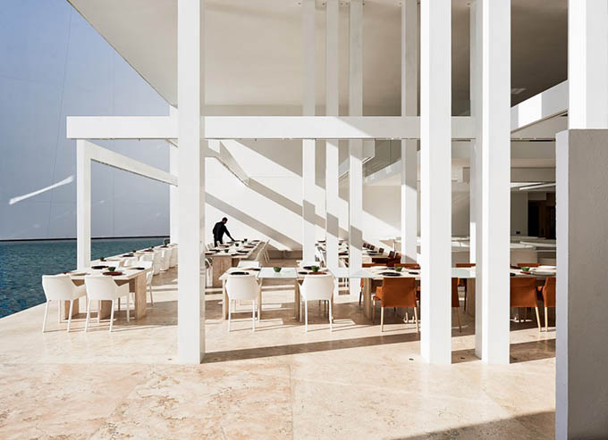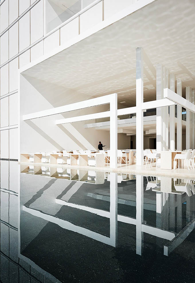 一層的餐廳中除了白色的構(gòu)架,沒有任何多余的裝飾物。三三兩兩的柱子或疏或密,形成了極富韻律變化的節(jié)奏感,而陽光穿過柱子,在地面上投下了不停變化的光與影。白色的裝飾物完美的隱藏了燈具軌道與埋線,并在形式上和結(jié)構(gòu)保持一致,成為了結(jié)構(gòu)的一部分,保持整體氛圍的簡約。純白的結(jié)構(gòu)、米色的地板、餐桌中點(diǎn)綴著紅褐色的椅子和餐具,素凈的色彩讓空間愈發(fā)的莊嚴(yán)和神秘。不遠(yuǎn)處的水面上,由藝術(shù)家用木藤編織而來的“鳥巢”咖啡廳漂浮在水面之上,成為了開闊空間中的唯一裝飾。