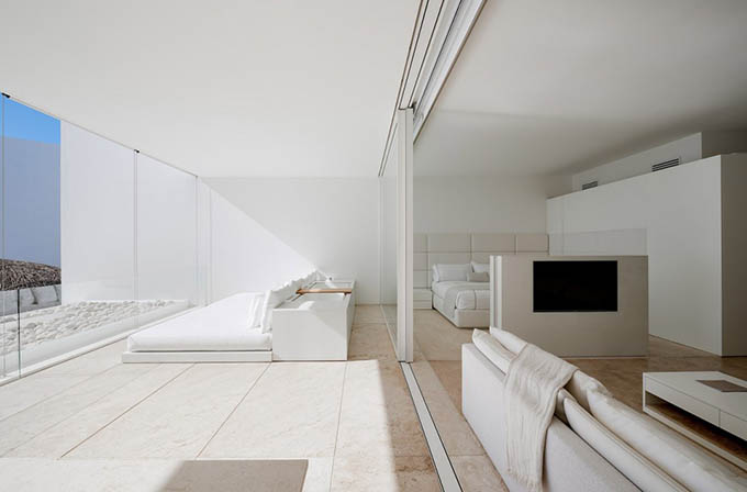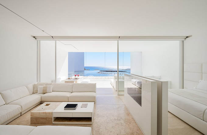 日光凝粹、一瞬韻律、素凈空靈、深眠于海——墨西哥經(jīng)典度假酒店設(shè)計(jì)案例,由著名酒店設(shè)計(jì)公司Miguel Angel Aragonés操刀。該酒店設(shè)計(jì)背景——灼熱的烈日下,沙漠向前不斷延伸,在盡端遇到了湛藍(lán)的大海,更遠(yuǎn)的地方,海洋和天空的界限時(shí)而模糊時(shí)而清晰。簡單、純粹的三條水平線將視野劃分出三個(gè)層次,除此之外別無他物。建筑師對基地的第一次探訪,便折服于大自然神奇的奇妙手筆之中。而在這似真似幻場景的兩側(cè),一座座建筑拔地而起打破了寧靜的天際線,激發(fā)了建筑師設(shè)計(jì)的熱情。