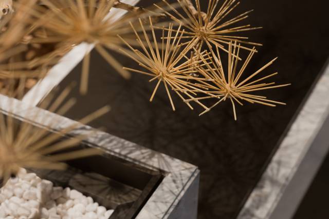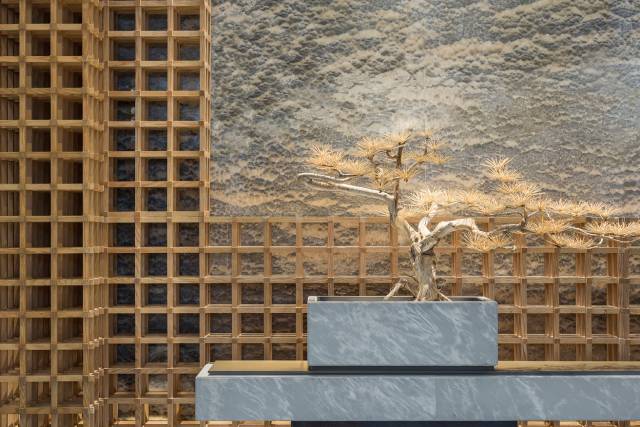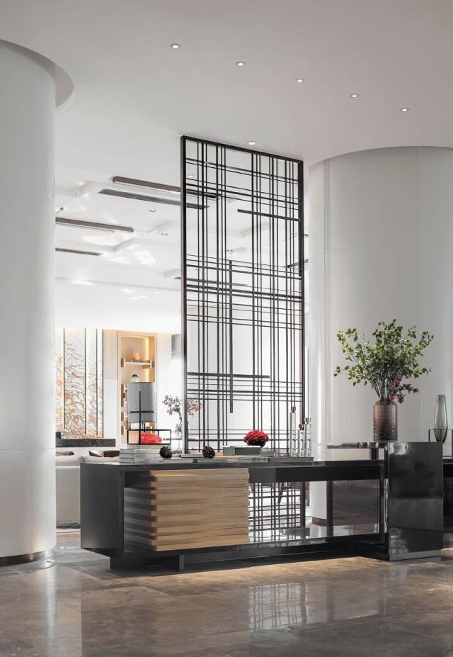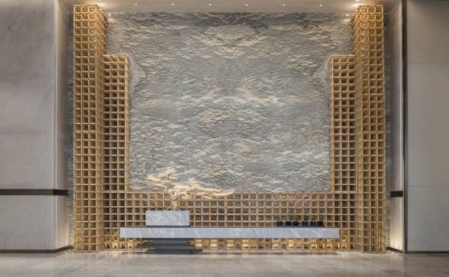 進入酒店大堂,映入眼簾的便是采用山水云石為背景搭配的藝術木架,這背景推進松柏,層層疊巒,讓人猶如畫中行,虛實結合,妙哉妙哉。