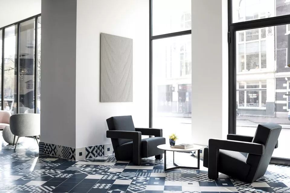 顧客進入酒店想要到達酒店入口首先要經(jīng)過弧形頂棚下方的白色水磨石樓梯。設計大膽的定制綠色水磨石墻壁定義出入口區(qū)域,種滿植物的立面為之增添了柔和的質(zhì)感。植物中間還鑲嵌著一串粉色的霓虹燈字:“呼吸”。建筑師為酒店接待處設計了一款帶有圖案的藍白色琉璃地磚,其設計靈感來源于荷蘭傳統(tǒng)的代夫特陶器。接待臺后方,鋪設著白色瓷磚的壁爐邊環(huán)繞著一排軟墊沙發(fā),搭配抱枕和地毯,帶來閱讀和放松的空間。一系列精心挑選出來的當代藝術品和特色燈具,共同為四周的墻壁帶來活力。