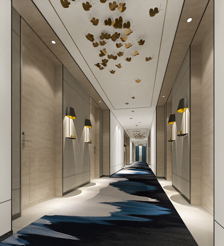 鄭州君鵬裝飾的設計師在設計走廊時同樣使用的是藍黃色調,酒店設計最重要的原則之一就是要保證酒店設計的統一,因此走廊不規則的圖案便于大堂的圖案相一致;燈光采用黃色燈罩來遮光,避免了燈太亮的刺激感,同時增加了舒適感;走廊的頂上面使用金黃色的蝴蝶裝飾點綴,如同漫步在天空與海洋之間一樣,有一絲活潑俏皮的感覺。
