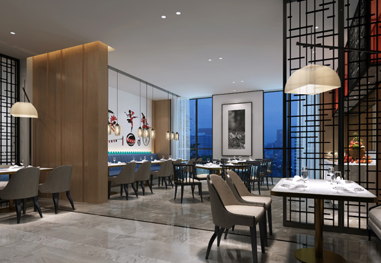 鄭州君鵬裝飾的設計師還專門為濮陽商務酒店設計了自助餐廳,自助餐廳的壁畫使用了紅色為主的舞女,每一個壁畫的動作都栩栩如生,給餐廳平添了一絲俏皮活潑的動感,動靜結合讓餐廳不顯得單調無味。設計師在每一個電梯處都設置了屏風背景,在屏風前面放置一瓶花,與旁邊的樹枝背景墻呼應,好似生機勃勃的春天。