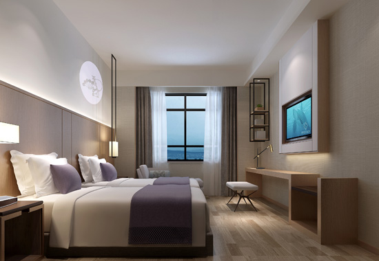 濮陽商務酒店客房設計采用原木色調,搭配藍色的裝飾畫,溫馨又不失浪漫。