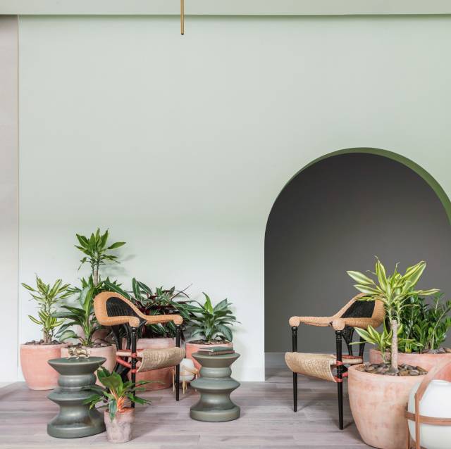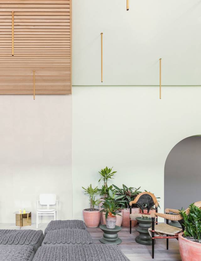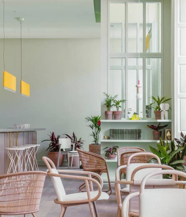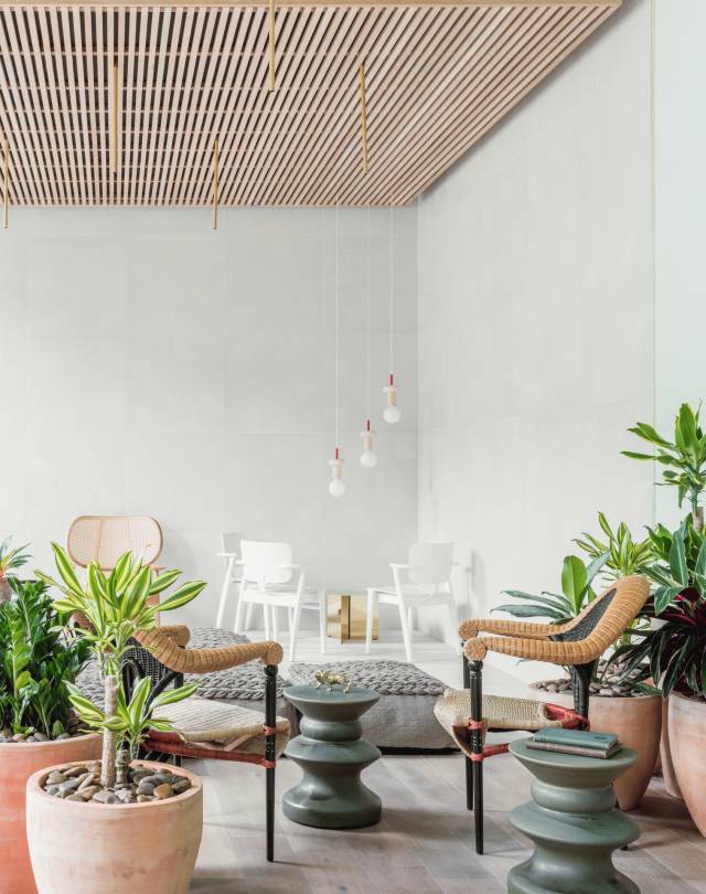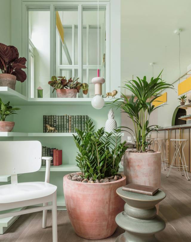 在一樓的咖啡廳和酒吧區,綠色的墻壁配有各種針織地板墊,定制的柳條家具,裝滿了綠色植物的陶罐點綴在期間,讓整個房間都更加溫暖起來。