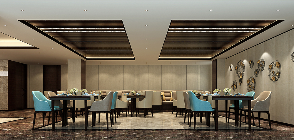 五層餐廳,中式設(shè)計(jì)在天花板和墻壁上給人留下了豐富的設(shè)計(jì)體驗(yàn),墻壁上古雅的造型裝飾品,運(yùn)用中式設(shè)計(jì)元素和線條,增強(qiáng)了古典視覺體驗(yàn),而頂部的原木線條在顯著設(shè)計(jì)藝術(shù)體驗(yàn)的同時(shí),也起到了界分不同空間的目的。
