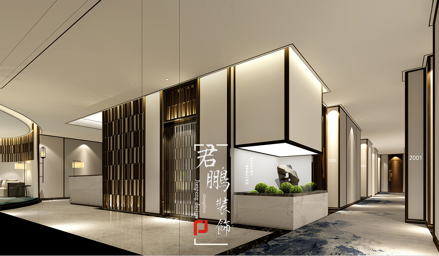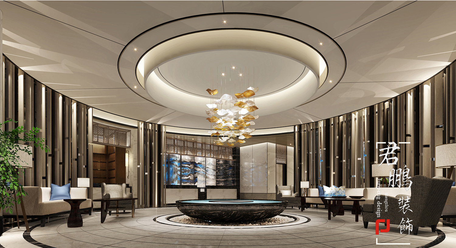 設計說明:森林。。。陽光。。。落水。。。在大堂中穿行,動靜之間,如鶴只靈動、優雅、自然的完美境界。。。